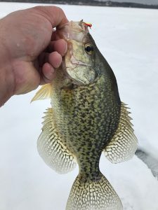 I joined my close friends, the Clark family for a few hours today and the fishing was nothing short of wonderful.  Bluegills and crappies were hitting the ice fairly fast.  We had crappies in the 9-11 inch range with a few larger and gills in the 7-10+ inch range including a monster hybrid that weighed in at 1 pound 2 ounces.  Lures really didn’t matter as long as they are on the small side which is a change compared to what should be happening.  Crappies wanted to hit horizontal presentations of plastic and small jigging spoons.  The gills seemed to prefer a more vertical presentation and your odds increased with the use of waxies.