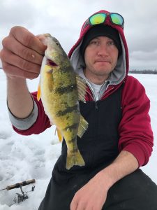 On Friday, we headed out on the water in search of some bluegills, crappies and perch and we found great fishing for all species.  On the first lake, the bluegills and crappies had moved out of their winter basin onto a weed flat just off the edge of the hole.  The fish were staging near the bottom in 8 feet.  The bluegills were hitting very light and required a smaller lure like a 1/32 oz Clam Drop Kick jig which is a  tungsten jig tipped with a waxie.  The crappies seemed to like a glow green demon jig also tipped with a waxie.  Some of the crappies were taking small 1/32 oz jigging spoons in pink and white.